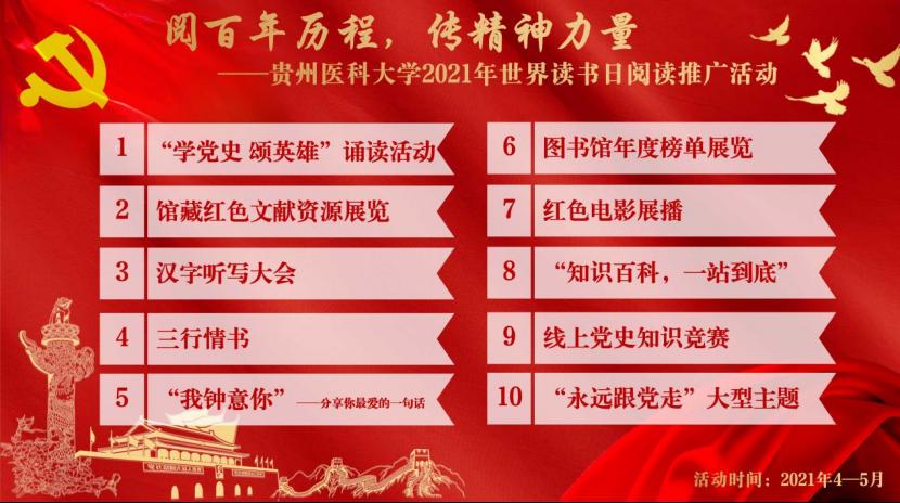 2021年是中国共产党成立100周年,是“十四五”开局之年,也是“两个100年”奋斗目标的历史交汇点。第十三届全国人大四次会议批准《中华人民共和国国民经济和社会发展第十四个五年规划和2035年远景目标纲要》,其中,“提升公共文化服务水平”一章中专门提出了“深入推荐全民阅读,建设书香中国'”。在2021年4月23日世界读书日来临之际,为深入贯彻习近平总书记在党史学习教育动员大会上的重要讲话精神和视察贵州重要讲话精神,积极响应中共贵州省委党史学习教育领导小组关于“高标准高质量开展好党史学习教育”的部署和要求,beat365拟通过阅读推广活动推进书香校园建设,并且在活动中融入省委教育工委省教育厅贵州高校“学党史颂英雄”百场诵读活动,以推动校园文明建设。