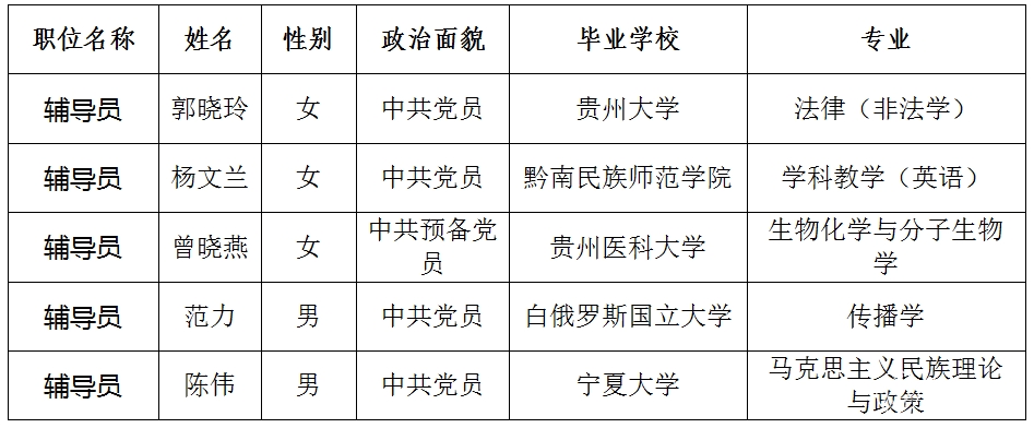 根据《关于公开选拔辅导员(非事业编制)的公告》要求,经过报名、资格审查、面试、体检等程序的考核,现将公开选拔辅导员(非事业编制)拟聘人员予以公示,具体情况如下: