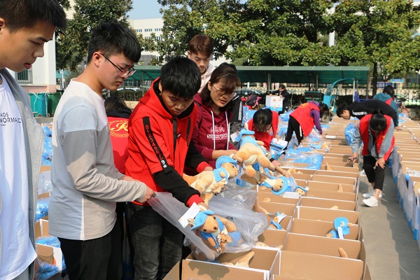 数小时后,温暖包中的物品全部放齐了,接下来是打包环节。打包是个精细又辛苦的活,在打包过程中,有的志愿者的手被划破了,但他们没有一丝抱怨,仍然耐心仔细地打包。来自九游体育官网的大二志愿者陶福江说:“虽然一个温暖包裹所能提供的物品有限,但我们通过参加这次活动,想到这些包裹将会给贫困地区的孩子们送去温暖,便觉得我们所做的很有意义。”
