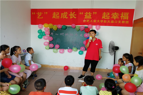 一间狭窄的教室中靠墙放着十多套桌椅,小小的黑板周围和地上放置了很多小气球,黑板上工工整整的书写了“用心呵护,助力成长”八个大字,大字的周围画满了音符和卡通玩偶,这是队员们花了一个中午的时间布置的艺术课堂教室。“留守儿童之家”的蒋老师很勉强的说到“这个教室是平时给孩子们上课、写作业用的教室,我们只会辅导他们写写作业,所以基本上没有什么设备。”实践队员们回应到“我们过来的时候都考虑到了,带了音响、话筒还有古筝,希望能够给孩子们插上艺术的翅膀。”,一旁的小朋友们用好奇的眼光紧紧地围在了教室的门口,他们争先恐后的说到“我可以进去吗?”“大家都可以参加”队员们亲切的回应到,不一会的功夫队员们将二十多位小朋友全部带进了教室。