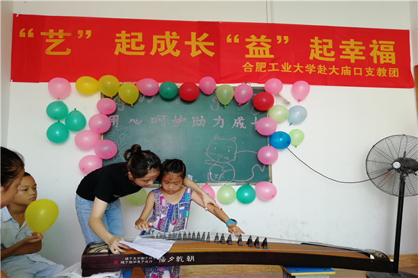 清脆悦耳的古筝声音让异常闷热的教室显得格外清凉,一曲《追光者》弹奏刚刚结束。后排的一个小姑娘扯着嗓子喊到“老师,老师,我可以跟您学吗?”。“当然可以啊,你过来我教你弹一下。”随后,一首“感恩的心”在支教团队员的带领下响彻教室,孩子们脸上洋溢着喜悦和稚嫩。在优美的音乐旋律中,队员们不自觉的做起了手舞动作,可爱的孩子们在音乐的带动下也自觉的做起了手舞动作。