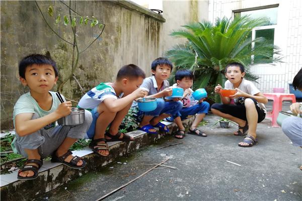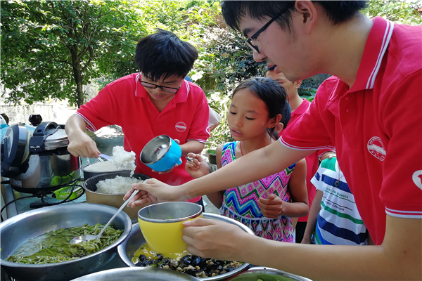 上午11点,一部分没有授课任务安排的队员们开始了帮厨任务,和阿姨们一起为孩子们准备午饭。“今天的午餐是清炒丝瓜、水煮鱼片、凉拌黄瓜。” 说着,队员们就开始添柴烧火热锅,接着下油炒菜,动作娴熟。厨房四周的墙体已被熏黑,里面除了三口小铁锅和一个水池外,还摆放着一张圆桌,花生油、酱油等放在灶台上。午饭时间,队员开始组织孩子们排起了长队,有的维持秩序,有的分饭,有的分菜,大家忙的不亦乐乎。分到饭菜的孩子们,有的席地而坐,有的随地站立,默默的吃着自己碗里面的饭菜。午饭后,队员们用自带的投影仪为孩子们播放了他们最喜欢的动画片《那年那兔那些事》 ,教室里显得格外安静,孩子们紧紧盯着模糊不清的投影看的特别仔细。