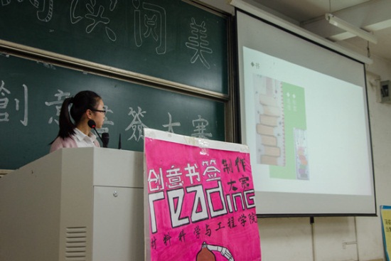 选手们围绕他们手工制作的书签进行了精彩的答辩,结合PPT更加直观地展示了各自书签的创意来源、制作过程、书签细节等方面。选手们从生活中提取素材,并将奇妙的构思融入到了他们的作品之中,以灵巧的双手精心制作出一张张独一无二书签;有的简约但不简单、有的精致典雅、有的古典优美。选手们别出心裁的构思和细腻独特的手工书签赢得了评委的一致好评。经过一个多小时的激烈角逐,土木与水利工程学院吕曦通过获得比赛一等奖。