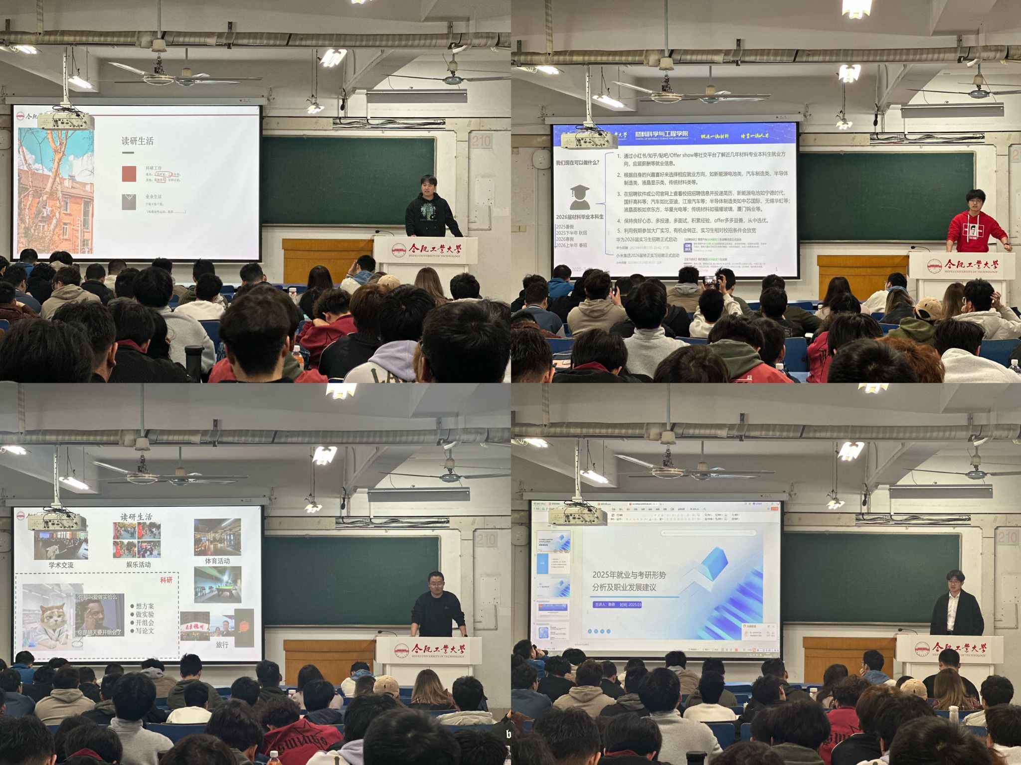 为助力2026届应届毕业生明确升学与就业方向,科学规划职业生涯,3月29日下午,九游体育官网在屯溪路校区西二教210室举办“材子领航”优秀校友经验分享会。活动特别邀请2022届毕业生4人进行分享,学院2022级全体本科生参与本次分享会。