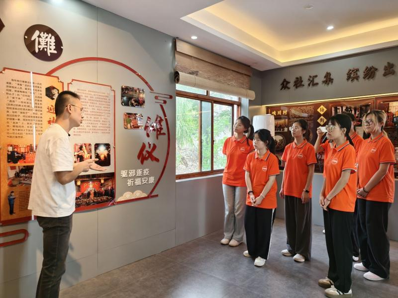 在梅街傩文化展示馆中,团队有幸邀请了当地副党委书记兼贵池区文化和旅游宣传大使许鑫磊同志担任讲解员。他从傩文化的起源——一种古老的请神敬祖、驱邪纳福仪式,到傩仪傩礼的不断发展,让团队了解到不同种类的傩舞、傩技以及具有固定剧情的傩戏,揭开广阔丰厚的傩文化谱系的冰山一角。团队成员们认真聆听,不时提出问题,与许鑫磊同志进行深入交流。