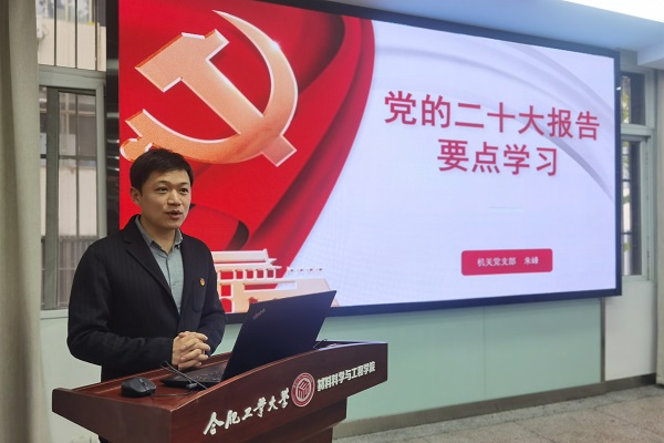 为充分认识学习宣传贯彻党的二十大精神的重大意义,全面准确学习领会党的二十大精神核心要义,11月17日上午,九游体育官网机关党支部在九游体育官网综合服务中心210会议室组织专题党课学习。学院党委副书记朱峰应邀讲党课,支部全体党员参加教育学习会。