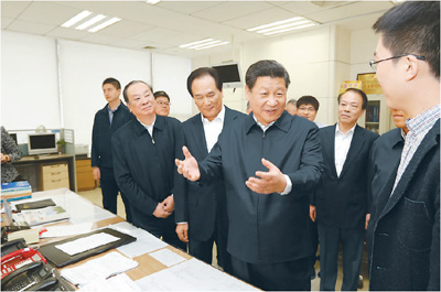 19日上午,习近平首先来到人民日报社调研。编辑楼内,一块块展板、一幅幅照片展示了党中央对人民日报的关怀,反映了人民日报社走过的不平凡历程。习近平一边观看,一边听汇报,他充分肯定人民日报创刊68年来为党和人民事业作出的重要贡献。在总编室夜班平台,习近平看编辑排版,同大家亲切交流,勉励他们不忘初衷、坚定信念,把报纸办得更好,为全国人民提供更多更好的精神食粮。习近平走进新媒体中心,在大屏幕前听取微博、微信、客户端工作介绍,并在一台电脑前坐下,通过新媒体平台发送语音信息,向全国人民致以元宵节的问候和祝福。