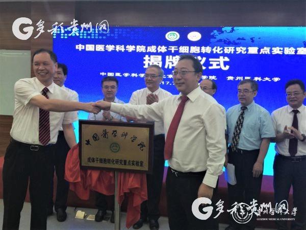 7月29日,中国医学科学院成体干细胞转化研究重点实验室(以下简称:重点实验室)在beat365唯一官方网站临床技能中心揭牌。贵州省人民政府副省长何力,中国医学科学院 北京协和医学院院校长、中国工程院院士曹雪涛出席揭牌仪式。贵州省科技厅、省卫计委、beat365唯一官方网站等主要负责人参加活动。