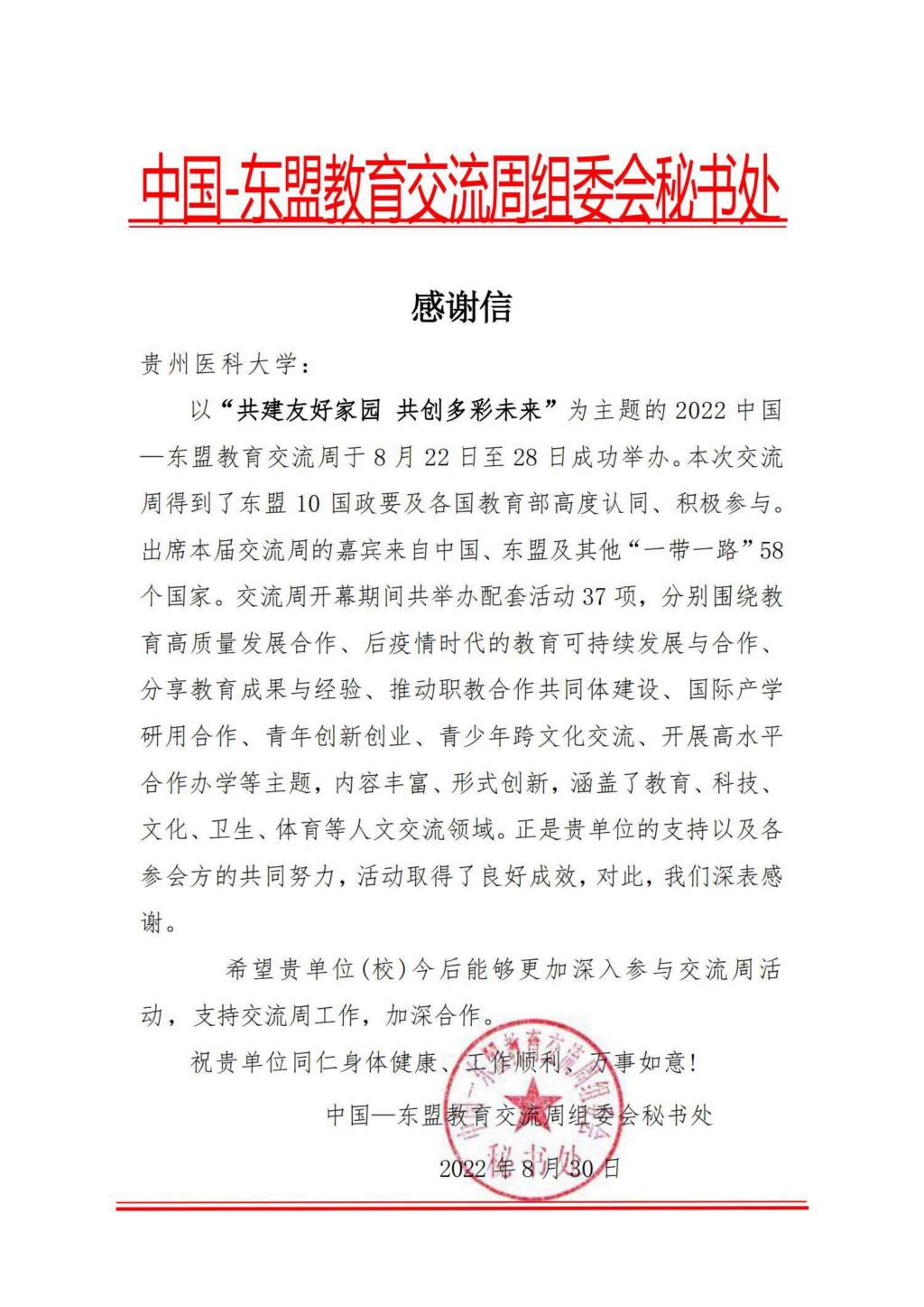 近日,beat365收到中国—东盟教育交流周组委会秘书处发来的感谢信,来信就beat365对2022中国-东盟教育交流周的支持参与,以及活动所取得的良好成效表示感谢,希望beat365今后能够更加深入参与交流周活动,支持交流周工作,加深合作。