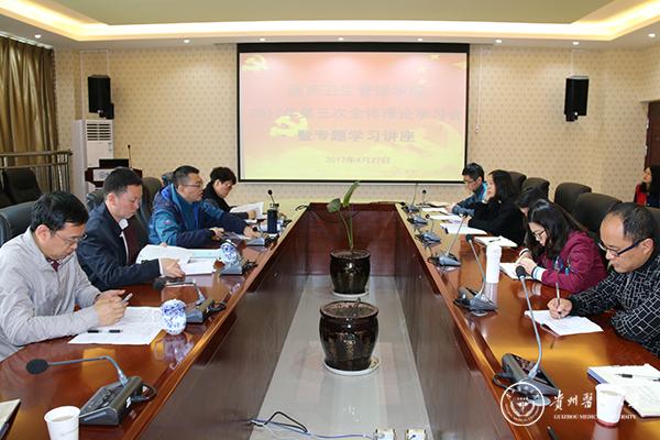 会上,院党委书记孙西凌领学了省第十二次党代会精神。本次大会,选举产生了贵州省出席党的十九大代表,在贵州参选的中央提名的代表候选人,中共中央总书记、国家主席、中央军委主席习近平,以全票当选党的十九大代表。习近平总书记在贵州参选,是对贫困地区群众的牵挂,是对贵州各级党组织的极大信任,是全省广大党员的无尚荣光,是对贵州打赢脱贫攻坚战的巨大激励。同时,习近平总书记以全票当选十九大代表,也充分体现了全省干部群众对习近平总书记的衷心爱戴和对以习近平同志为核心的党中央的坚决拥护。孙西凌还就“三个高于、一达到、五翻番”、 “5个100工程”、 基层医疗卫生“五个全覆盖”、农村“三变”改革、绿色经济“四型”产业等专业词向学院职工进行了介绍和解读。