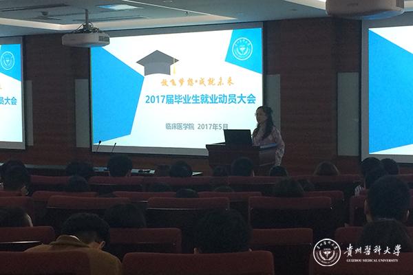 分团委书记黎冉从招收名额、报名流程、国家政策方面给同学介绍了“西部计划”相关事宜,鼓励大家报名参加西部志愿者服务。学生科科长李莉则根据贵州省关于住院医师规范化相关文件,给未就业同学和定向班同学进行了相关的解释和说明。年级辅导员介绍了从2016年12月到2017年5月到校招聘单位的总体情况,重点分区介绍了单位对临床医学专业的要求,并鼓励目前未就业的同学积极主动联系用人单位。