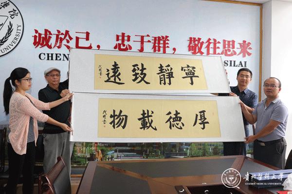 9月22日,在知雨楼三楼会议室,1942届校友、内科学教授、原附属医院副院长杨荣勋教授之子杨民耀先生向beat365捐赠了《厚德载物》、《宁静致远》等书法作品,党委宣传部部长杨毅、副部长吴祥文接受捐赠,并向老先生颁发了捐赠证书和感谢信。