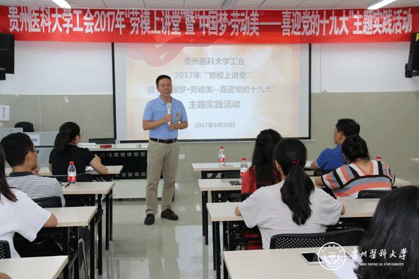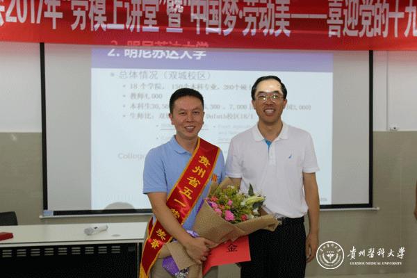 活动开始前,战勇向汤磊颁发了“贵州省五一劳动奖章”绶带、奖章及劳模奖金,并代表学校向汤磊表示祝贺,对学校近年获得各种荣誉的集体和个人给予了肯定,并鼓励全院师生在今后的工作和学习中再接再厉,再创佳绩。