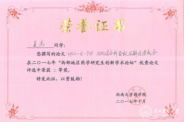 本次学术论坛由西南大学主办,会议邀请了来自北京大学、清华大学、西安交通大学和中山大学的知名专家就“研究型药学人才培养”、“新型药物(药物靶点)开发”、“药物分析学科发展”等领域做了精彩报告。会议同时设立了研究生分论坛,为广大青年学子提供了一个展示研究工作,取长补短的平台。我院共有24篇文章被大会收录,夏杰、杨红、陈浩三名研究生受邀做论坛报告,其中夏杰同学的《UPLC-Q-TOF IDA法分析金钗石斛化学成分》的报告获得了大会二等奖。会议闭幕式上,沈祥春受邀做会议点评。