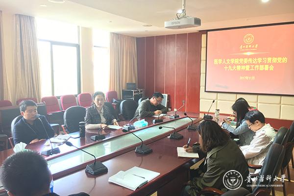 11月6日,医学人文学院党委在善思楼南楼4楼会议室召开了传达学习宣传贯彻党的十九大精神暨工作部署会。学院党委委员、各支部书记、支委参加学习。会议由学院党委副书记(主持工作)徐贵荣主持。