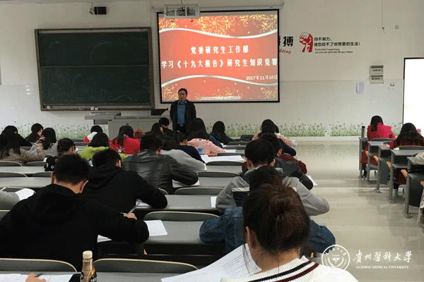 为深入学习贯彻党的十九大精神,11月10日,党委研究生工作部在南校区宏远楼9201教室举行学习《十九大报告》暨十九大知识竞赛活动。党委研究生工作部副部长余资江、分团委书记包欢欢和就业办公室主任刘旖旎,60余名硕士研究生会和分团委学生干部参加。活动前,余资江介绍党的十九大精神,包欢欢对活动形式、要求及内容作了详细介绍。竞赛以笔试形式进行,主要以党的十九大精神为主要考点,从思想政治建设、文化建设、经济建设、生态文明建设以及国防建设等方面。通过笔试,黄梅、陈婷婷获一等奖;王蓝晨、张丽、杨非、陈宗跃、吴国萍获二等奖;李卓君、赵爽、段恬筱、李莹、李星星、陈晓雪、彭金刚获三等奖。
