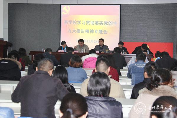 11月28日,药学院在格物楼六楼多功能厅召开学习贯彻落实党的十九大报告精神专题会议。药学院党委副书记廖兴江、副院长廖尚高、党委委员李莉、傅晓钟、张敏出席会议,各科室负责人和全院党员参加。