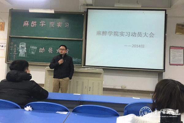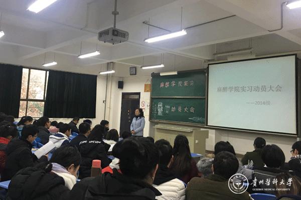 为加强同学们对专业实习的精准认识,做好充分的实习前准备,顺利完成为期1年的实习任务。麻醉学院12月17日在北校区2301教室召开了实习动员会,麻醉学院党委书记刘建华,副院长高鸿等及 2014级全体学生参加。会议由辅导员徐青主持。