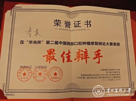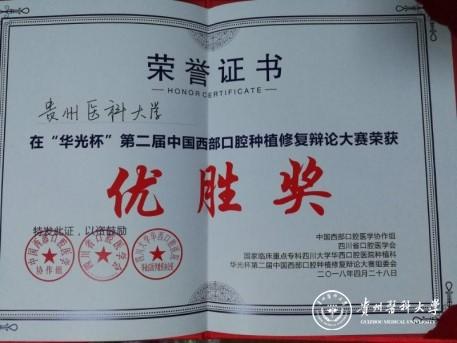 最终以微弱优势惜败空军军医大学,获得“华光杯中国西部口腔种植修复辩论大赛优胜奖”,其中董强、田艾获得“优秀指导教师”奖,李英(研究生一年级)荣获“最佳辩手奖”。