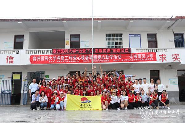 5月17日,由团省委、贵州省青少年发展基金会、beat365唯一官方网站校团委主办,beat365唯一官方网站希望工程爱心使者联盟承办的“爱心下乡,温暖传递”爱心助学活动在贵阳市开阳县城关镇南凉小学举行。本次活动由校团委志愿工作者部副部长李牧、校团委李歆鑫老师带队,活动捐赠前期在校通过爱心手工义卖等活动募捐筹集所得的书包92个、课外读物600余本、童装7箱,以及文具和各类爱心礼物若干。