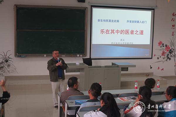 周石以“乐在其中的医者之道”为主题,围绕“认识医学影像学”、“医学的本质”、“医务工作者应具备的素质”三大主题作了动员讲话,鼓励和要求新生要树立正确的人生目标,珍惜学习机会,因兴趣而工作学习,因工作学习而产生兴趣,未来做一个幸福的医者。