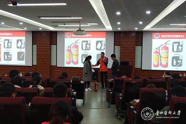 杨万义教官结合近年来火灾案例,通过播放火灾现场视频、展示火灾事故图片、现场与同学互动等方式,向全院师生介绍了引发火情的原因及造成的危害,详细讲解了发生火灾后的自防、自救及逃生技能,通过现场演示,指导大家如何使用灭火器、安全锤等有关消防器具。最后,杨教官针对日常工作中所遇到的消防问题与大家进行互动,为大家进行了详细解答。