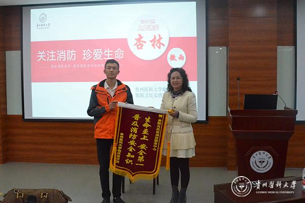 11月14日,临床医学院杏林微雨人文论坛第十二讲在临床技能中心207会议室开讲。本次讲座旨在提高全院师生的消防安全和责任意识,进一步加强消防安全工作。讲座邀请了贵阳卫民安消防服务中心杨万义教官,全院师生做“关注消防 珍爱生命”强化消防宣传,普及消防安全知识讲座。临床医学院辅导员、专兼职学生工作的青年教师和两百名学生参加,讲座由学生科科长李莉主持。临床医学院党委副书记杨婕代表临床医学院赠予“生命至上 安全第一;普及消防安全知识”锦旗致谢贵阳卫民安消防服务中心。