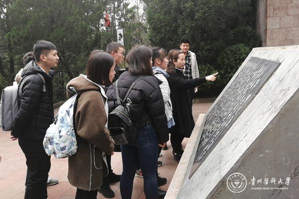 在遵义红军烈士陵园,王妤煜介绍本次活动的目的和意义,带领同学们向革命先烈们鞠躬缅怀,她希望学生们能珍惜如今美好的生活,不忘初心,建功新时代;邓欣带领党员同学重温入党誓词;最后,陈培各向大家介绍了红军长征的过程及遵义会议召开的意义,学习先烈们的英勇精神。