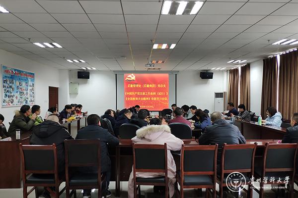 12月26日,后勤管理处(后勤集团)党总支在南校区颂雅楼五楼后勤管理处(后勤集团)会议室组织召开党总支专题学习会议,传达学习全国全省教育大会精神、《中国共产党支部工作条例(试行)》。处长孙西凌主持会议,党总支委员出席会议、各党支部书记、后勤管理处(后勤集团)副科级以上干部、全体党员、部分职工代表参加会议。