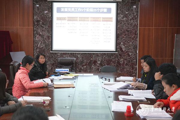 会上,蒋红梅按照《中国共产党章程》《中国共产党发展党员工作细则》和《贵州省发展党员工作程序》要求,结合实际,带领大家认真学习了党员发展的“五个阶段25个流程”,详细分析了在党员发展过程中关键环节的把握,并将各环节相关责任明确到人、落实到人。她指出,党委及支部要高度重视党员发展工作,严格标准、严格培养、严格程序、严格责任,从该项工作真正做到从严管党治党,扎实做好发展党员的每一个环节。参会人员围绕党员发展工作中的实际问题以及学院党委今后该项工作的规划进行了交流讨论。