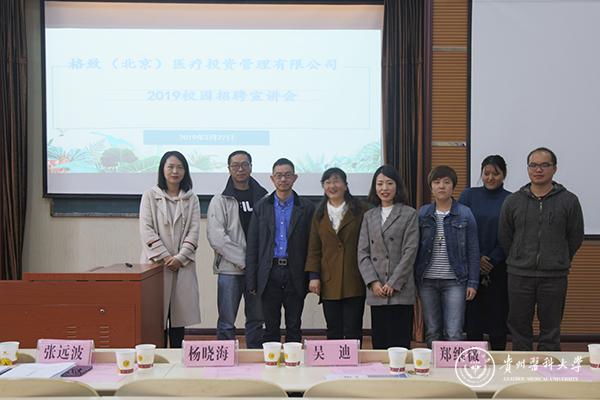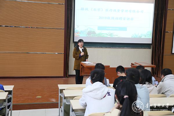 会上,院党委书记封韬代表学院向嘉宾的到来表示欢迎和感谢,对毕业生情况作了简单的介绍,并提出了几点希望,思考自己想做什么?能做什么?怎么去做?对自己有一个清晰的定位,先就业再择业,希望同学们能在此次招聘宣讲会中有所收获。格致(北京)医疗投资管理有限公司董事长张远波与同学们分享了他的创业故事,并从公司目标,运营理念等方面进行介绍。