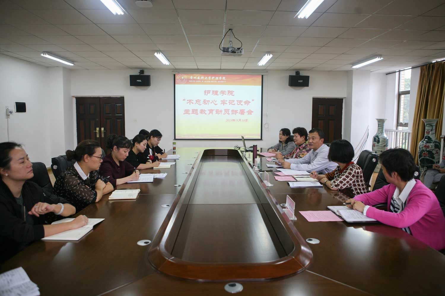 9月18日,护理学院在南校区百川楼5楼会议室召开“不忘初心、牢记使命”主题教育动员部署会。会议深入贯彻落实党的十九大精神以及中央、省委、校党委关于“不忘初心、牢记使命”主题教育工作系列部署,对护理学院“不忘初心、牢记使命”主题教育进行动员部署。校主题教育第二督导组组长孙超出席会议并讲话,院党委书记杨英作动员讲话,院长贾秀英主持会议,全院教师参加了会议。