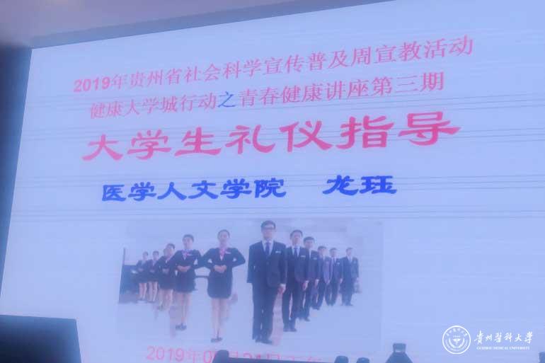 为庆祝新中国成立70周年和贯彻贵州省社科联《关于开展2019年贵州省社会科学宣传普及周活动的通知》精神,搞好社会科学宣传普及活动,积极开展“健康大学城”行动,提高大学生人文素养,培养知礼节、懂礼貌、有涵养、有修为、有魅力的大学生,9月24日,beat365在南校区道德讲堂举办了题为《大学生礼仪指导》的礼貌礼仪宣讲活动。讲座由大健康学院院长陈玉其主持,医学人文学院讲师、国家注册礼仪培训师(高级)、中国校园礼仪培训师龙珏主讲,全校300多名学生参加。