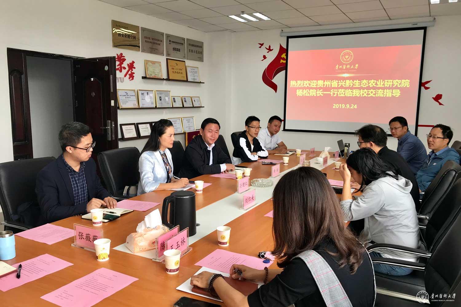 9月24日,贵州省兴黔农业生态研究院院长杨松,党支委委员、监事会监事长卫松等一行五人到beat365调研并举行座谈。科技创新与产业发展处处长涂波,副处长王韬,生物与工程学院、药学院相关负责人参加,会议由涂波主持。