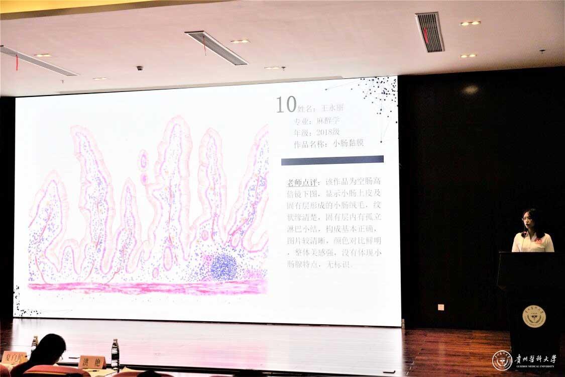 同学们对自己的作品创作进行了精彩的阐述,经过评委老师们的认真评审最后口腔医学院黄丽同学的作品《淋巴之美》荣获一等奖,基础医学院李晏宁同学的作品《生精小管》、基础医学院代亚芸同学的《卵巢仿真图及各级卵泡》和来自海外学院的Erica的《肝小叶或门管区》荣获二等奖,海外学院的MalikMuhammadZain-ul-Abideen同学的作品《卵巢》、基础医学院郭甜甜同学的作品《卵巢》、基础医学院梁会同学的作品《肾小体》、医学检验学院张陈晨同学的作品《初级卵泡组织切片光镜下示意图》、麻醉学院王永丽同学的《小肠黏膜光镜绘图》荣获三等奖,口腔医学院糜文乐同学的《斑斓》和医学影像学院周志博同学的《肝小叶》荣获最佳人气奖。