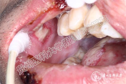 (患者治疗前后的口腔黏膜病损对比 上图:治疗前,下图:治疗1周后)