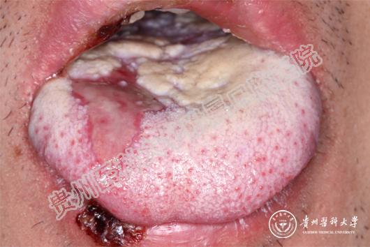多见于嘴唇及颊部、舌头。开始时,口腔黏膜有烧灼感,明显充血发红、水肿,有时出现红斑、水疱,但疱很快破溃形成溃疡或糜烂。大面积的溃疡或糜烂会形成大量渗出物,形成假膜,疼痛非常明显,严重影响进食和说话。