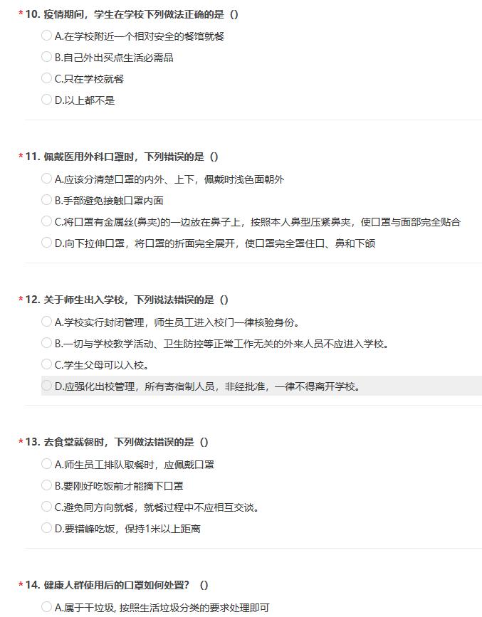 此次测试以“问卷星”为载体,采用线上闭卷考试的形式。试题涵盖了新型冠状肺炎的流行病学特点、返校途中的防护措施、返校后的隔离原则、用餐注意事项、消毒用品及使用方法、口罩的使用及处理、洗手的时机等新冠肺炎防控校园重点知识。截至4月22日全部师生完成测试。