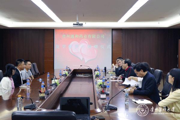 5月27日,贵州源和药业有限公司在beat365唯一官方网站南校区举行“复学献爱心”捐赠活动。贵州源和药业有限公司董事长简卫光、副总经理罗江、人力资源部部长彭琳峻到校捐赠。校党委副书记、校关工委常务副主任战勇代表学校接受捐赠,关工委办公室主任刘梅华、副主任周辉,设备处、招就处、药学院、医药卫生管理学院等部门负责人参加了捐赠活动。