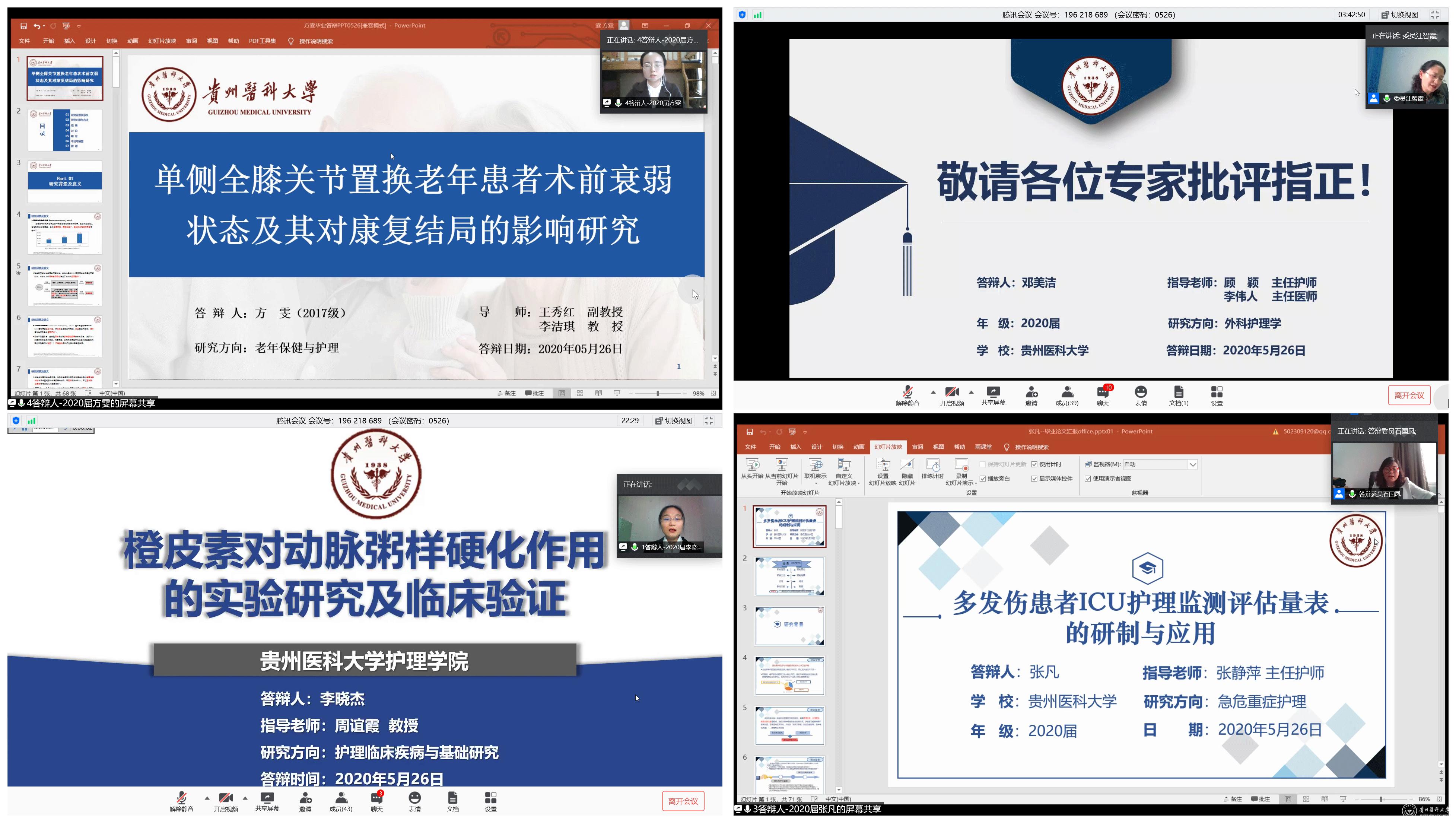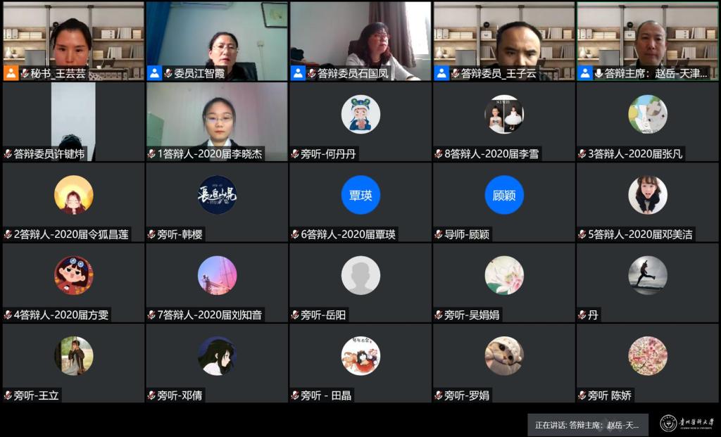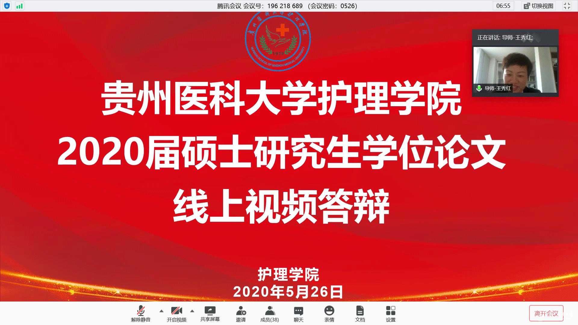 在疫情防控期间,为贯彻落实教育部《关于做好2020年上半年毕业研究生学位授予相关工作的通知》文件精神、贵州省以及学校疫情防控有关文件要求,做到管理不放松、质量不下降、毕业不延误,确保研究生培养顺利完成,护理学院于5月26日通过腾讯会议平台进行了2020届硕士研究生学位论文答辩。