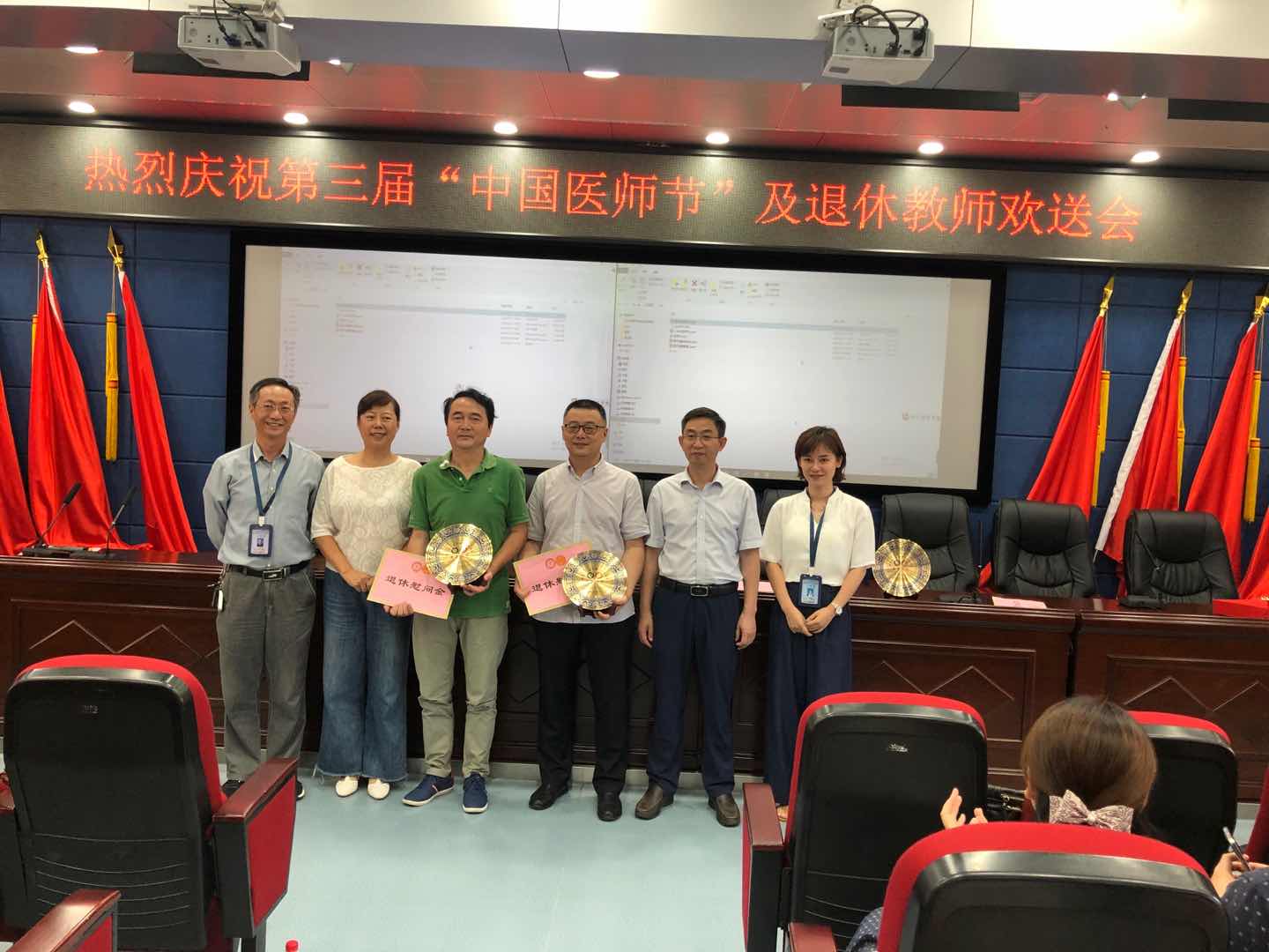 我院王金生、周瑛、刘洪亚三位老师将于今年光荣退休,特以此次医师节为契机,感谢退休医师、教师在医院发展建设中做出的贡献,由张军梅、唐正龙、王永、钱禾为他们颁发了退休纪念品和慰问金。