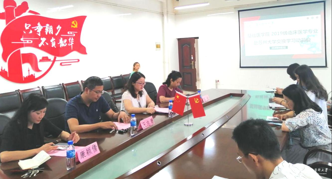 为做好beat365学生赴苏州大学交换学习工作,9月2日,基础医学院在务本楼W201召开临床医学专业2019级学生赴苏州大学交流学习动员大会。教务处副处长汪志勇、基础医学院党委副书记王妤煜、副院长康颖倩、副处级组织员邓欣,各年级辅导员以及赴苏州大学交流学习的15名学生参加动员会。