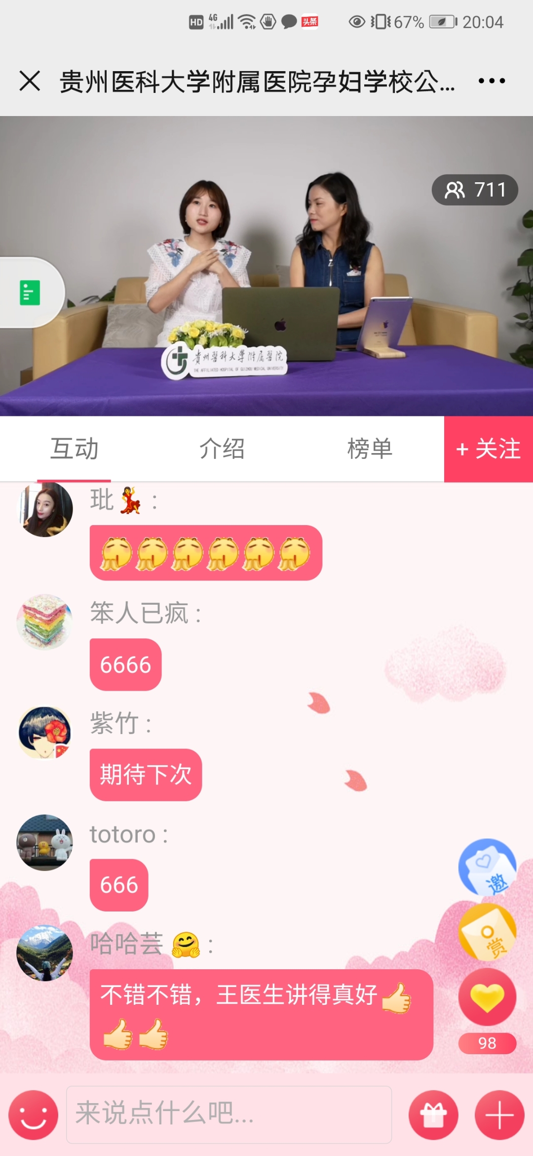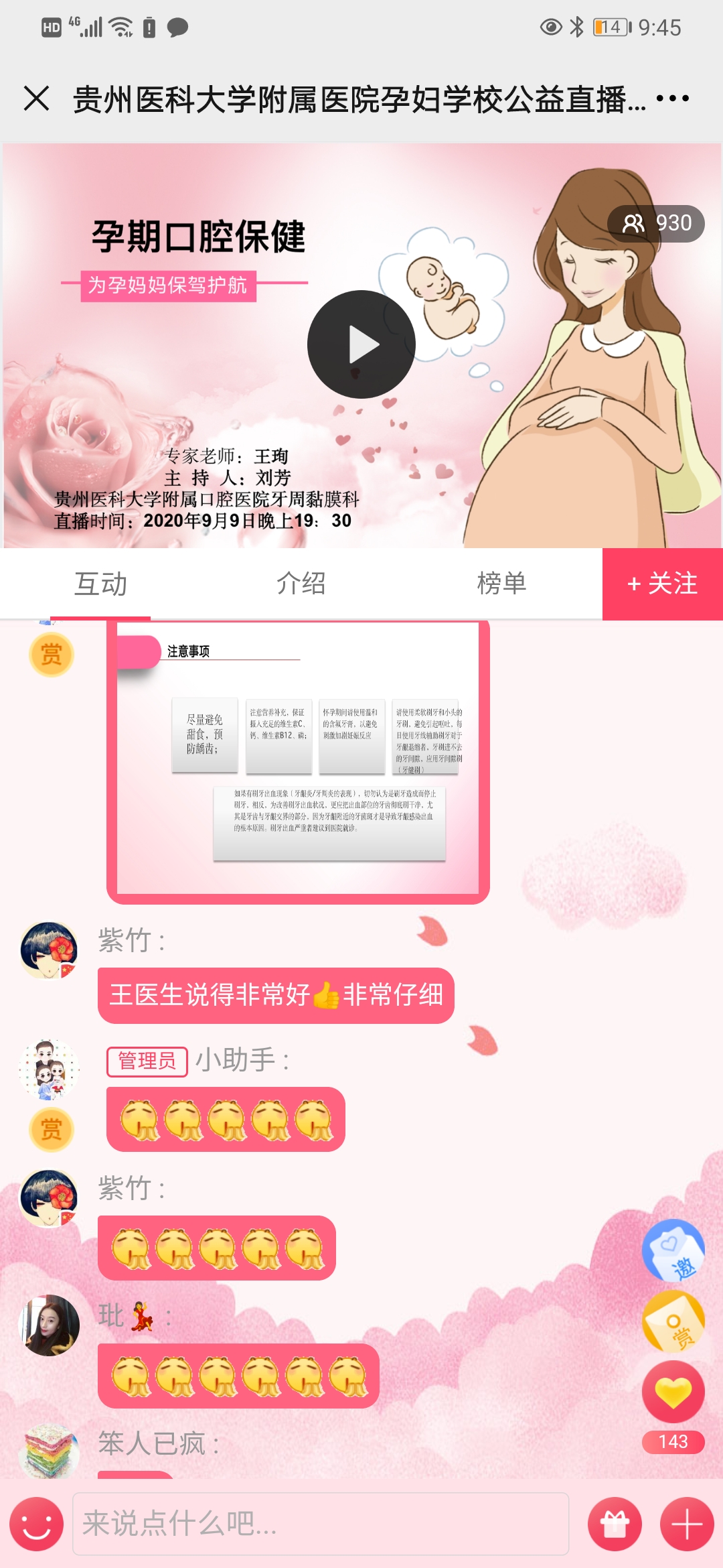 在直播课堂中,王珣重点讲述了怀孕对口腔健康的影响,孕期口腔疾病有哪些严重危害,孕期常见口腔问题以及孕期看牙时机,并针对怀孕这个特殊时期,详细讲解了孕期及哺乳期口腔保健注意事项,以及孕前应做哪些准备,最终达到不带牙病怀孕的目的。参与直播课堂人数有900多人次,观众热情高涨,直播间互动热烈,纷纷表示老师讲解仔细,学到了很多实用的口腔保健知识,表示会向周围朋友宣传了解到的口腔知识。