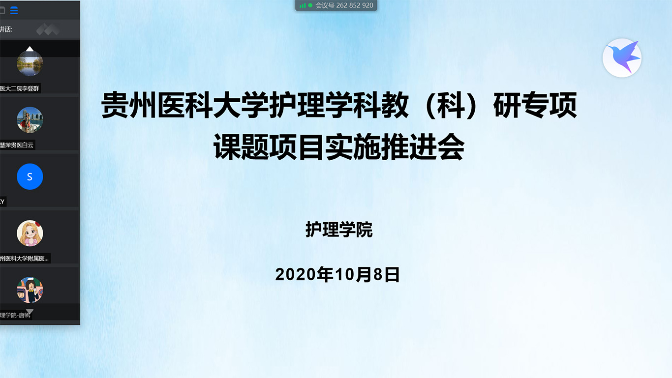 10月8日,由护理学院组织召开的2020年beat365唯一官方网站护理学科教(科)研专项课题项目实施推进会通过腾讯会议形式举行,护理学院、附属医院、第二附属医院、第三附属医院、附属肿瘤医院、附属白云医院、附属乌当医院等7家直属附院的课题负责人近50人参会,会议由护理学院院长李亚玲主持。