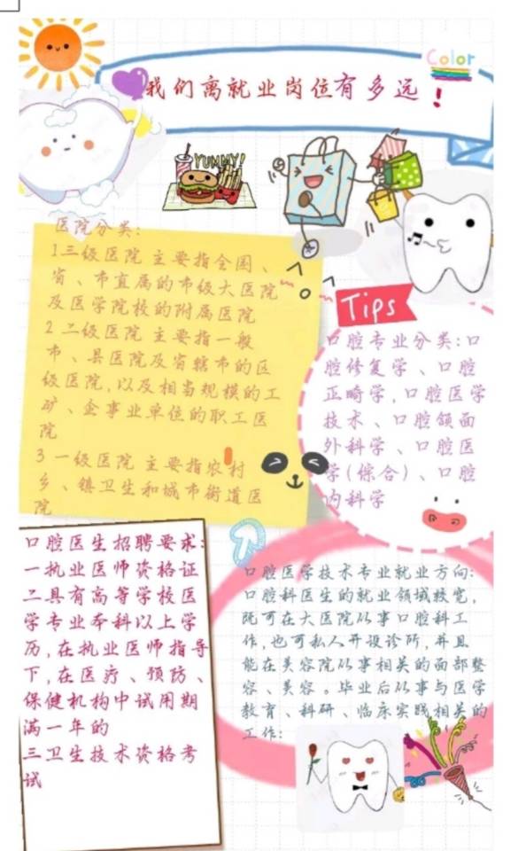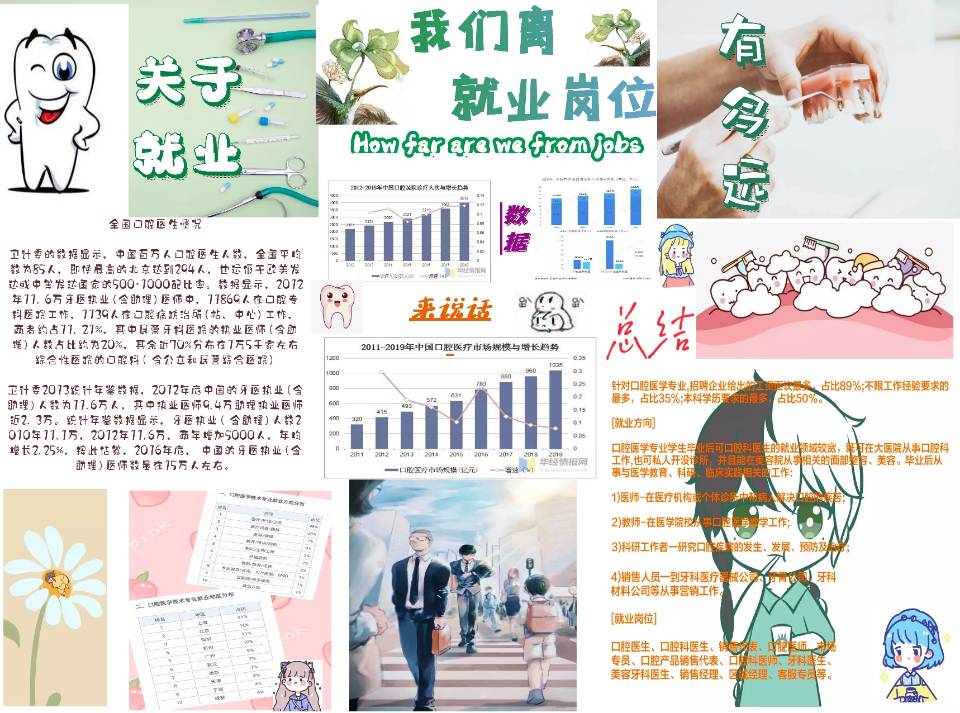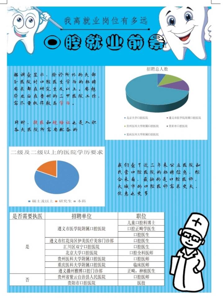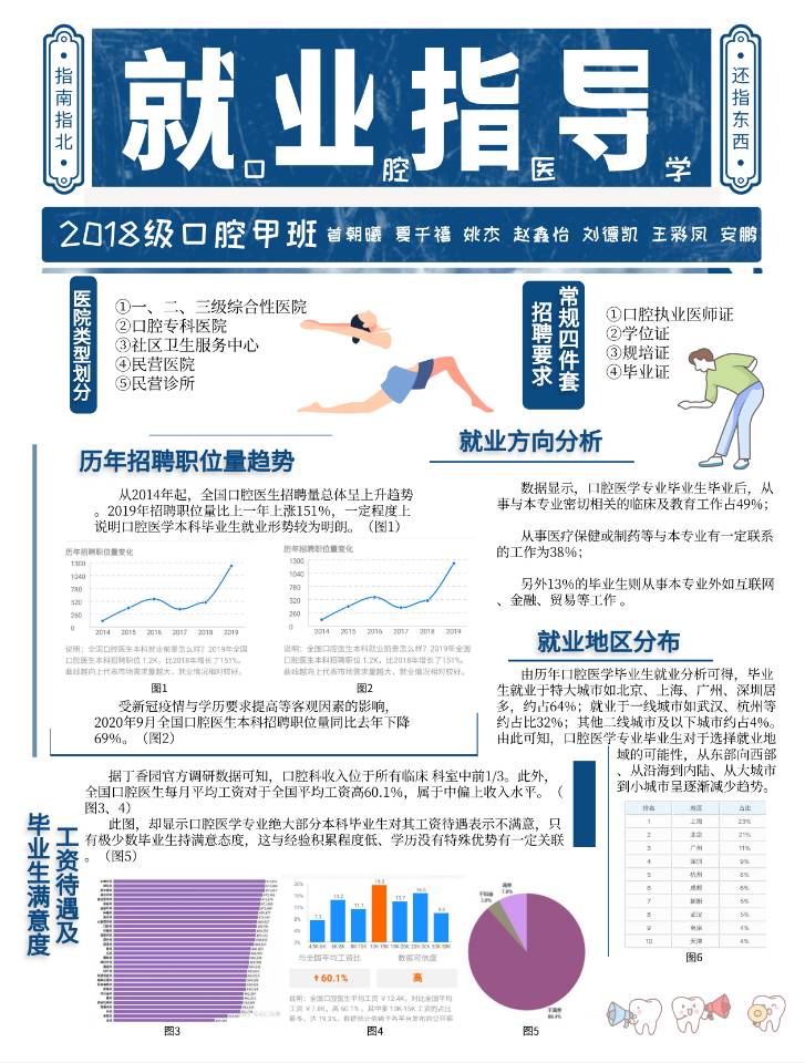 毕业后许多大学生处在迷茫和焦虑中,“高不成低不就”成了大学生毕业后的普遍现象。为帮助学生摆脱迷茫焦虑,及时做好职业规划,口腔医学院10月至11月开展了“我离就业岗位有多远”海报大赛活动,要求同学们在规定时间内收集本专业历年就业情况,根据数据制作出海报。本次比赛切实做到了全员皆行动、每生有收获。