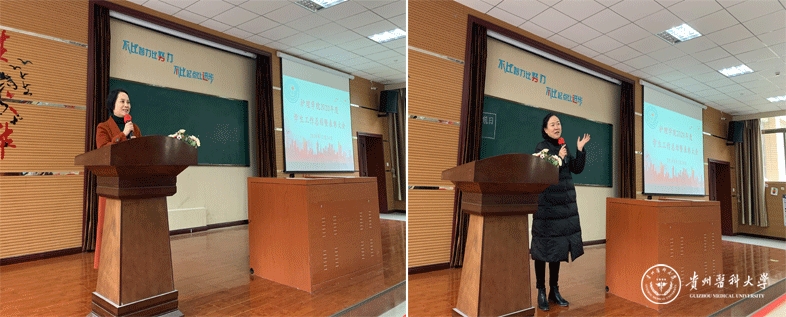院长李亚玲讲话,她向一年来为学院学生工作付出辛勤劳动的老师和学生干部表示感谢,同时希望同学们学好专业课,通过自身的求学和工作经历引导大家对护理行业确立比较清晰的认识。