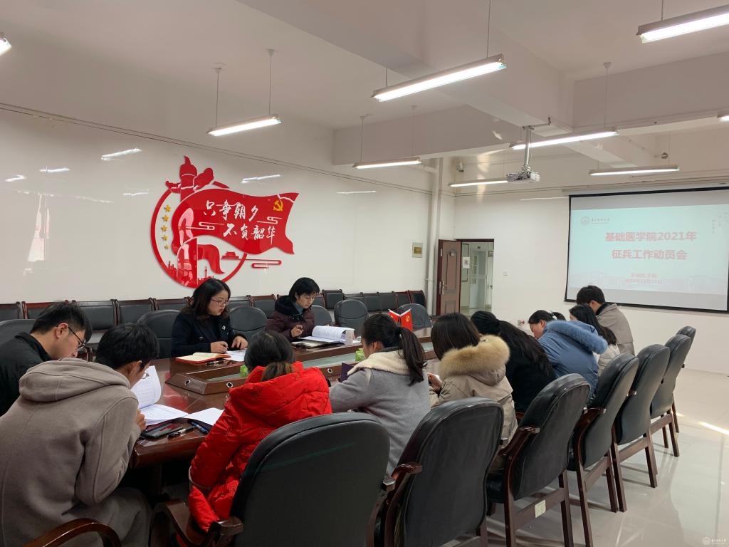 为贯彻落实国家征兵政策,积极鼓励和引导大学生应征入伍,按照beat3652021年征兵工作部署会的要求,基础医学院12月24日在务本楼W201会议室召开2021年征兵工作动员会,学院党委书记付萍、副书记王妤煜、学生科、分团委及全体辅导员参加会议。