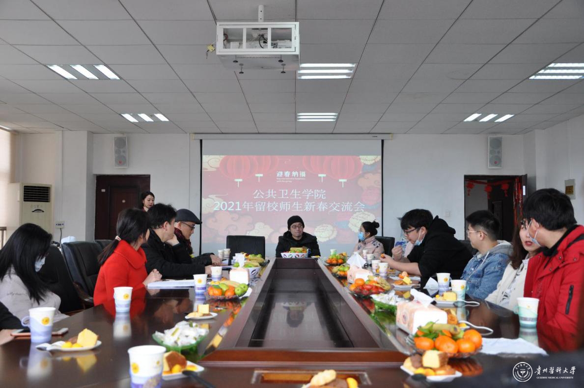 2月5日,公共卫生学院在博雅楼二楼会议室组织召开留校师生新春交流会。公共卫生学院党委书记杨光红、院长洪峰、副院长李军、党委副书记何江、综合办副主任陈峰峰及留校师生参加此次会议,会议由学院团委书记柴颖主持。