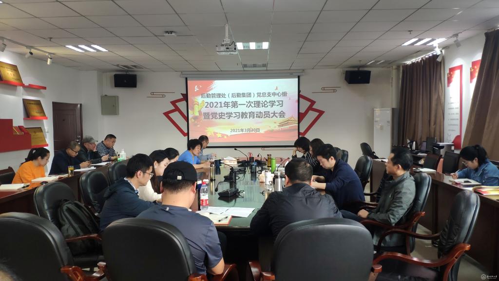 3月30日,后勤管理处党总支理论学习中心组在南校区颂雅楼五楼后勤会议室召开2021年第一次理论学习暨党史学习教育动员大会,全体党员参加。会议由后勤管理处(后勤集团)党总支书记张玲玲主持。