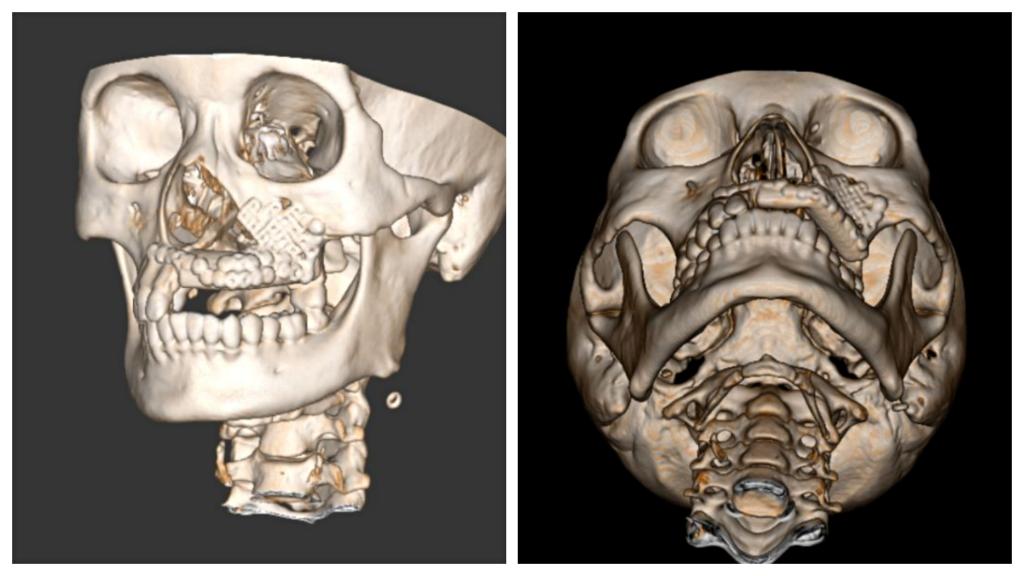 目前,口腔医院完成血管化骨瓣移植修复重建下颌骨、血管化肌皮瓣修复软组织缺损已超百例,技术成熟,各类骨肌皮瓣存活率极高。但上颌骨肿瘤因临近鼻腔、上颌窦、眼眶等重要复杂结构,缺损的形态不规则,切除后缺损的修复有极大难度。上颌骨切除术后会导致口鼻瘘、面型畸形、语言及进食障碍、甚至对病人及其家属造成巨大的心理障碍。口腔颌面外科致力于解决患者的病痛,利用计算机辅助设计 / 计算机辅助制造(computer assisted design/computer assisted manufacture,CAD/ CAM),精准切除肿瘤及修复上颌骨缺损。术前设计、术中准确控制以及术后可靠预测,手术可获得理想上颌骨重建效果。在满足患者外形需求的同时,还保障了相关功能,真正做到了个性化功能性修复重建。